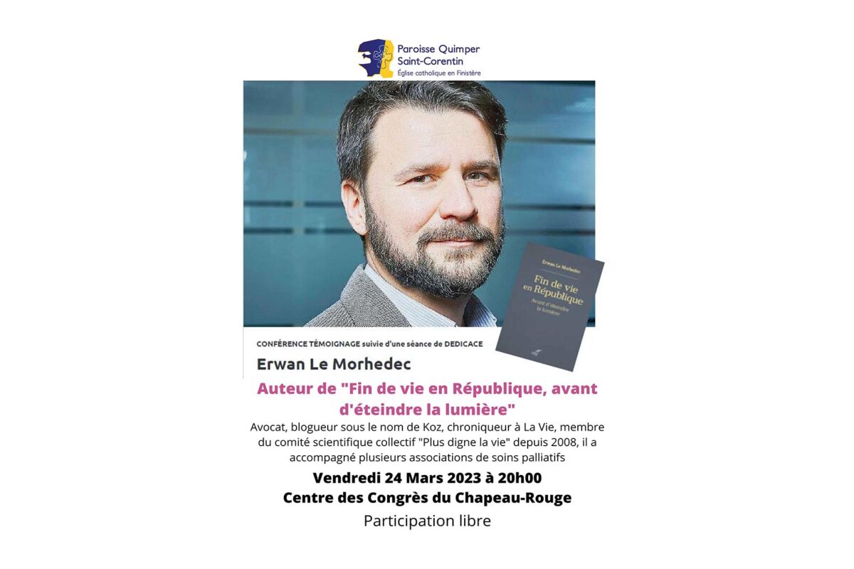 Dans le cadre du débat sur la fin de vie, la paroisse Quimper – Saint Corentin organise le vendredi 24 mars prochain à 20h00 au Centre des Congrès du Chapeau-Rouge une conférence avec Erwan Le Morhedec.