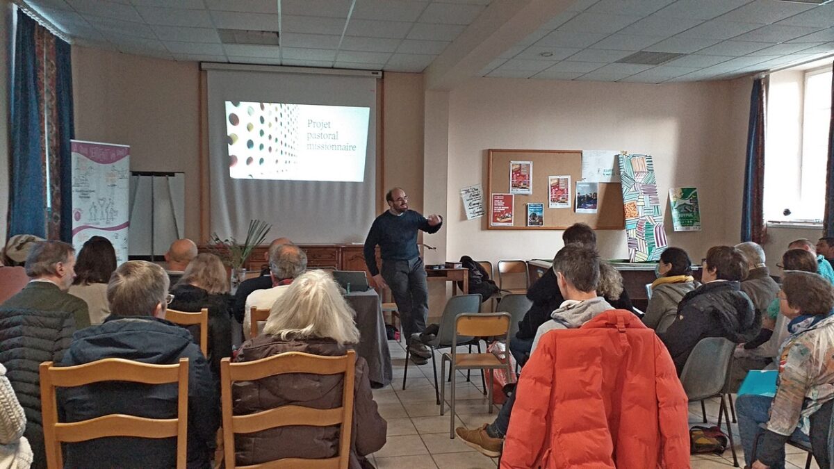 Le père Erwan, curé de la paroisse, a accueilli les participants et présenté la démarche, avant de laisser la parole à deux témoignages. Denise et Thierry ont expliqué comment après plusieurs décennies loin de l’Eglise, ils sont revenus en son sein suite à une rencontre pour l’une et une lecture pour l’autre. La sincérité de leur propos a touché le cœur des auditeurs.