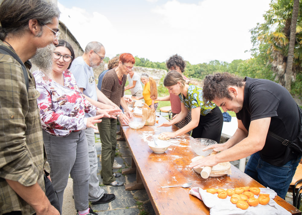 La plupart s’interroge sur la raison de leur présence. Pour briser la glace, l’équipe pilote propose de cuisiner ensemble des tartes aux abricots. Avec des produits locaux et de saison. On se remonte les manches et chacun met la main à la pâte. « Mets plus de sucre. » « Coupe les abricots en deux. » « Regarde, je peux utiliser les chutes de pâte pour faire une décoration. » Quelques temps après, les quatre tartes partent au four.