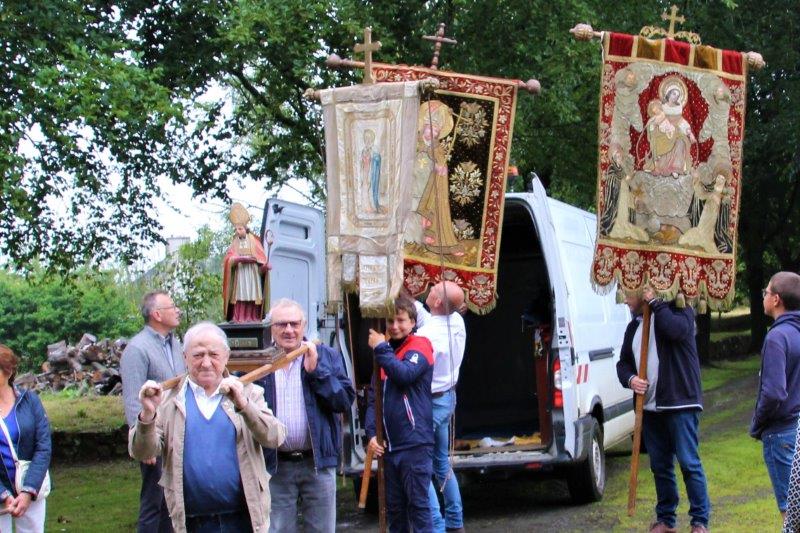 Les conditions météorologiques de ce jour n’ont pas permis le déroulement de la traditionnelle procession : les bannières, les statues de St Divy et de Ste Nonne ont fait une brève incursion à l’entrée de la chapelle.