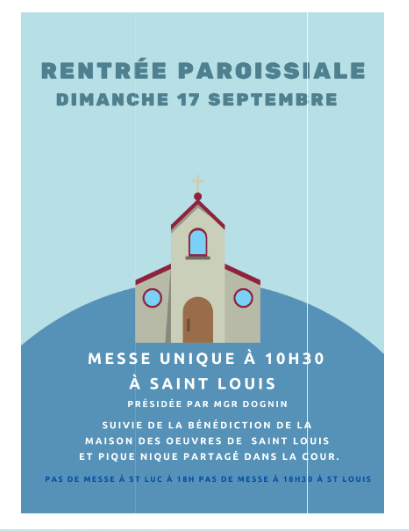 N’oubliez pas que la messe de la rentrée paroissiale se tiendra le 17 septembre avec une messe unique à Saint-Louis. La cérémonie sera suivie de la bénédiction de la Maison des œuvres.
