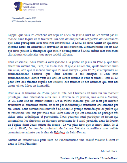 Michel Block, Pasteur de l’Eglise Protestante Unie de Brest, prêchera à la messe de 18h30 le dimanche 22 janvier dans le cadre de la semaine de prière pour l’unité des chrétiens.