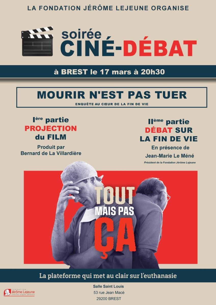 Venez comprendre les enjeux de l’euthanasie grâce au documentaire de Bernard de la Villardière « Mourir n’est pas tuer », suivi d’un débat en présence de Jean-Marie Le Méné, président de la Fondation Jérome Lejeune.