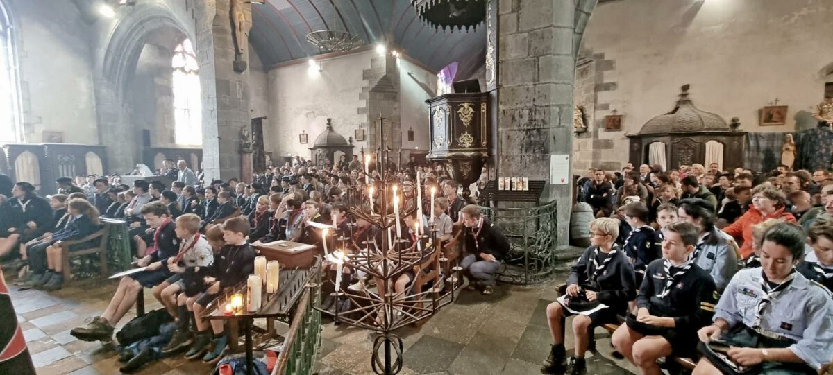 Il y avait foule à Rumengol ! Près de 500 personnes (300 scouts et leurs familles) ont participé à la messe de rentrée des Guides et Scouts d’Europe du Finistère. La pluie du matin a déplacé la célébration à l’intérieur de l’église (plutôt qu’à l’autel des Pardons) : on s’est serré sur les marches, sous l’orgue, jusque par terre… ambiance simple, joyeuse et très familiale.