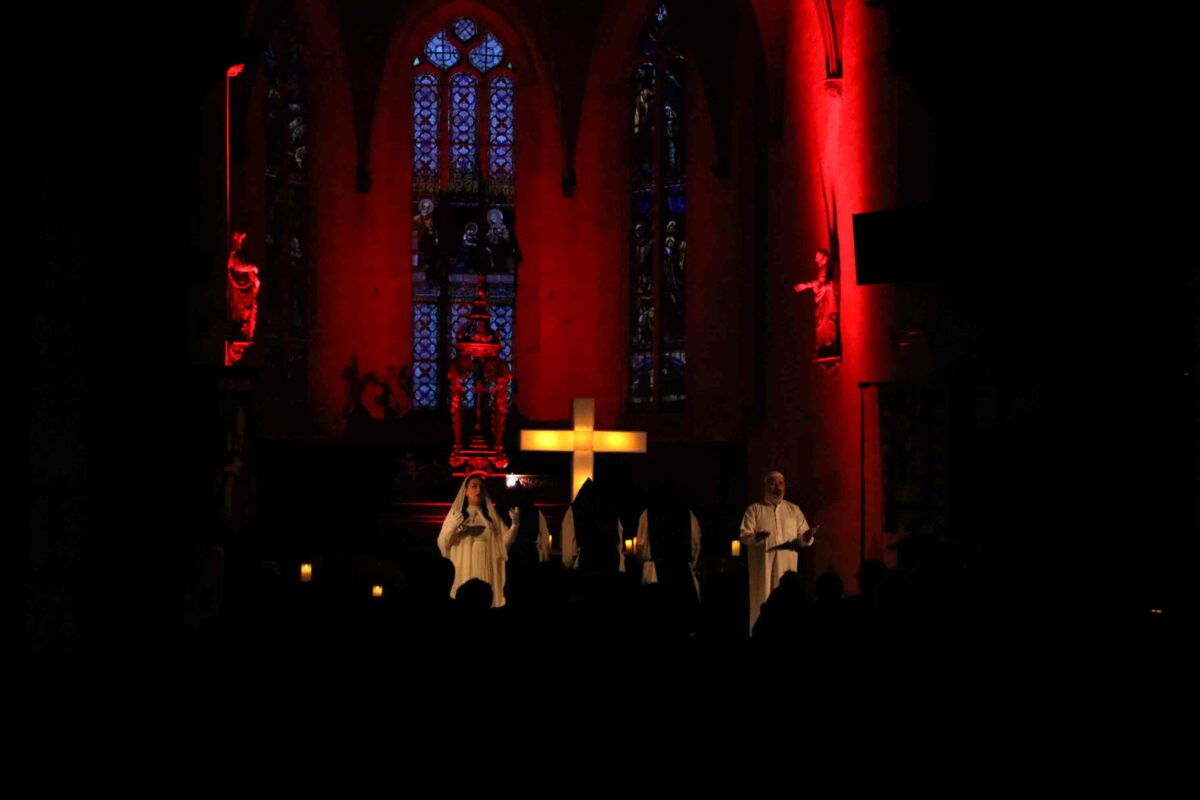 La mise en scène, le jeu des comédiens, l’apport de chants sacrés donnent une force à ce spectacle et permet de transmettre ce témoignage profond, par le sang versé.