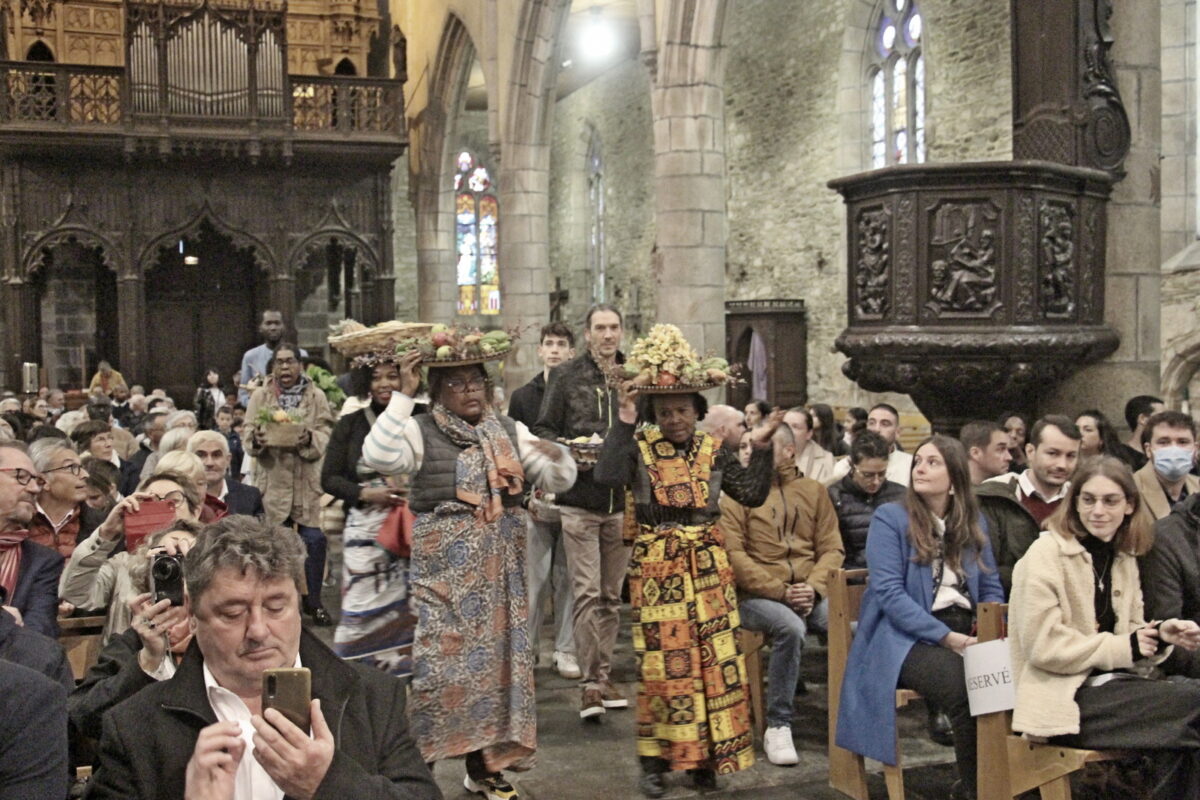 L’église de Saint Houardon à Landerneau a été animée d’une ferveur toute particulière, ce dimanche 19 octobre 2025, clôturant en beauté la Semaine Missionnaire Mondiale, sous le thème: « Missionnaires de l’espérance parmi les peuples ». Des fidèles originaires de différentes nations se sont rassemblés, formant un peuple unique, témoin vivant de l’universalité de l’Église. Ce brassage de cultures et de cœurs a incarné le sens profond de la semaine missionnaire mondiale. La messe a été présidée par le père Yves Andriantsoa et concélébrée par les pères Sébastien Guiziou, vicaire général et Ewan de Kermenguy curé de la paroisse.