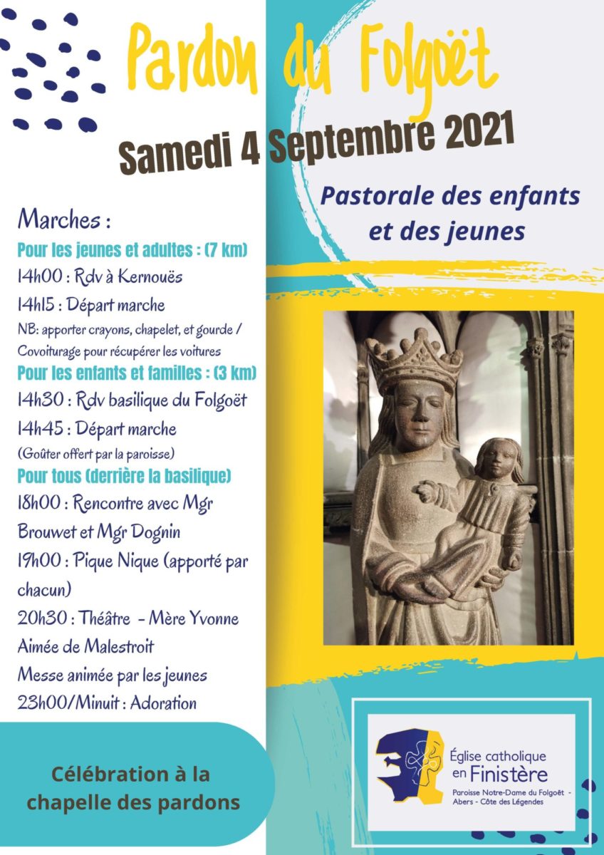 Comme chaque année, une marche est organisée pour les jeunes et adultes le samedi du pardon du Folgoët. Cette année, rdv à Kernouës à 14h00 samedi 4 pour 7 km de marche (ce qui signifie covoiturage à l’arrivée pour récupérer les voitures à Kernouës, sauf si vous vous organisez à plusieurs pour laisser des voitures au Folgoët avant le départ afin d’être autonomes ensuite sur la récupération des véhicules).