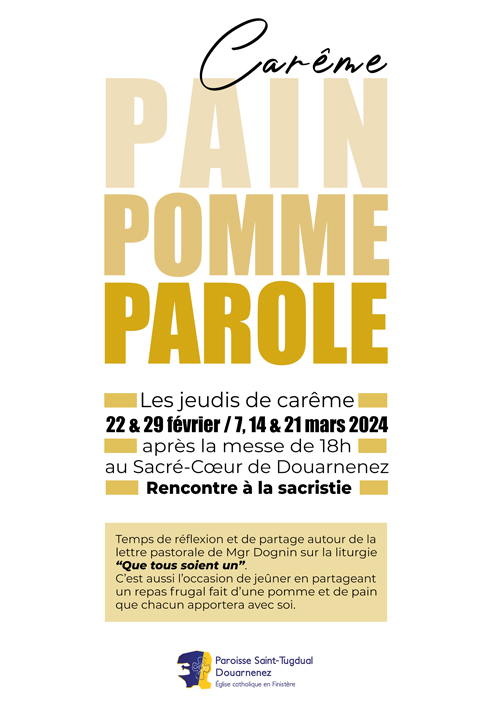 À partir du jeudi 22 février et jusqu’au jeudi 21 mars, la paroisse Saint-Tugdual Douarnenez organise une rencontre hebdomadaire « Pain-Pomme-Parole » autour de la lettre pastorale de Monseigneur Dognin sur la liturgie « Que tous soient un » et de la lettre apostolique du pape François « Desiderio Desideravi ».