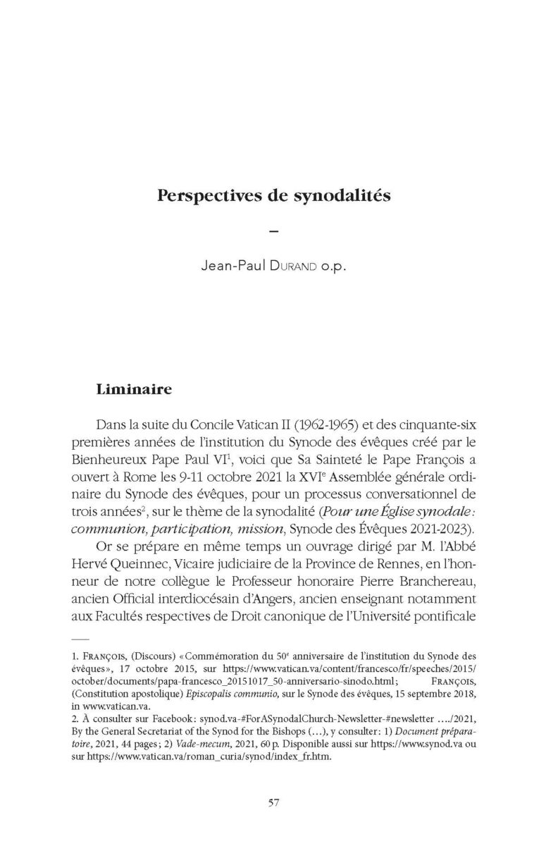 Le dominicain Jean-Paul Durand, canoniste et moraliste, spécialiste du droit comparé et du droit public ecclésiastique, livre dans cet article quelques réflexions sur la synodalité. Depuis l’institution du synode des évêques en 1965, l’importance de ces assemblées – ordinaires, extraordinaires ou spéciales – n’a cessé de croître jusqu’au « synode sur la synodalité » ouvert en 2021, qui pourrait s’achever avec une « redéfinition de cette institution » (p. 60). L’auteur étudie les diverses formes que pourrait prendre un synode renouvelé, et pose la question de son pouvoir législatif. Il ne passe pas sous silence certains risques : une synodalité qui serait trop influencée par un modèle séculier, ou qui buterait sur les écueils contraires du cléricalisme ou de la tabula rasa. Sous ces questions se pose celle de l’essence de l’Église en tant que structure hiérarchique. Jean-Paul Durand livre ici des pistes de recherche pour une institution ecclésiale et une synodalité bien comprises.
