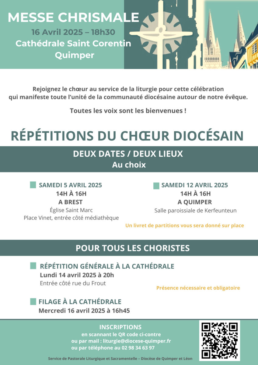 Que vous soyez chantre-animateur, membre de la chorale de votre paroisse ou chanteur occasionnel au sein de l’assemblée, rejoignez le chœur diocésain pour participer par le chant à la célébration de la messe chrismale qui aura lieu le mercredi 16 avril 2025 à 18h30 à la cathédrale de Quimper.