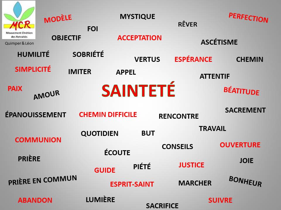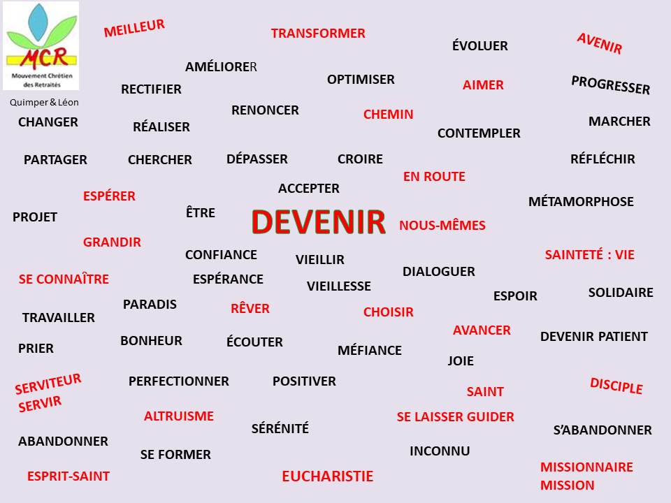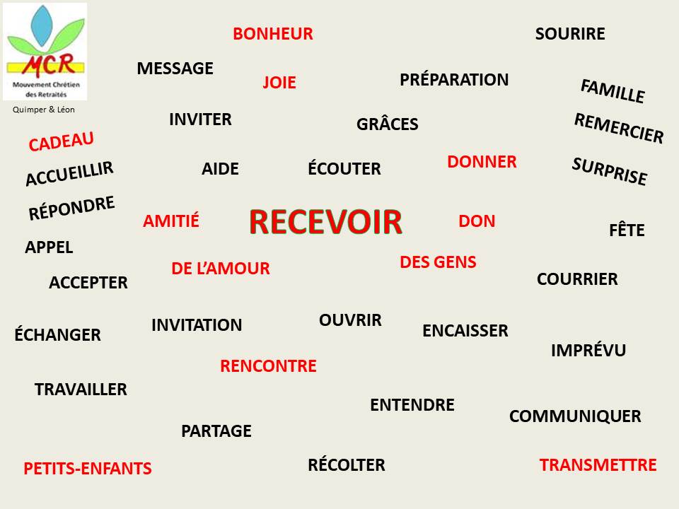 ► RECEVOIR – DEVENIR : le père Désiré Larnicol propose un « brainstorming » (tempête de cerveaux). Qu’évoquent pour nous ces deux verbes ? Les propositions fusent de toutes parts démontrant la vitalité et l’activité de nos neurones. « Bien heureux sommes-nous ! » Vu le succès de ce petit jeu, nous y ajoutons le mot sainteté.