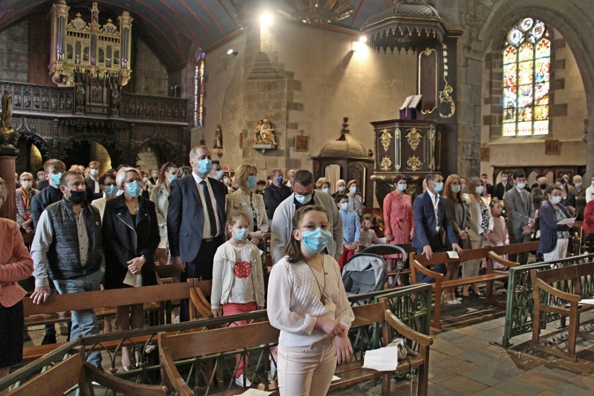Dans l’église Notre-Dame de Rumengol, dimanche 6 juin 2021, quatre enfants des communautés de l’Abbaye et du Cranou ont fait leur première communion. Entourés de leurs catéchistes qui les ont préparés à cet évènement et de leur famille, les jeunes ont participé à l’animation de la messe par des textes, prières et remerciements.