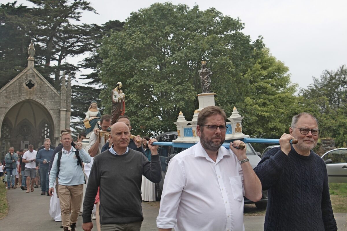 Partis de Ste Marie du Menez-hom sous un crachin breton (qui n’a pas permis cette année de profiter des paysages splendides), les pèlerins ont fait une première étape à Landévennec vendredi 30 juin. Samedi, c’est à la chapelle du Folgoad que Mgr Dognin, notre évêque, les a rejoint. Dans une homélie très vigoureuse, l’évêque les a exhorté à puiser leur force en Dieu, à l’exemple de St Joseph. Trop souvent nous avons une image « lisse » de St Joseph, oubliant combien l’action de Dieu dans sa vie a été déroutante pour lui. Il a dû chercher, avec son intelligence, les solutions humainement les plus justes… et se laissant dérouter par Dieu.