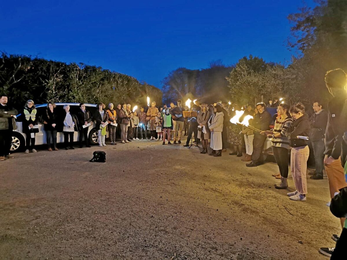 A la lumière du cierge pascal, 150 personnes ont pèleriné dans la nuit de samedi à dimanche pour une veillée pascale itinérante à Dirinon. Au fil de la marche, les lectures de l’ancien testament ont permis de revivre l’histoire de l’alliance depuis la création du monde jusqu’aux prophètes, cheminant au côté du mystère de l’humanité, entre ténèbres et lumière. La bénédiction de l’eau à la fontaine St Divy a préparé le baptême de Sarah et Lyra, deux jeunes qui ont été baptisées au cours de cette veillée dans l’église de Dirinon dont les cloches ont sonné à toute volée à 23h00 pour annoncer la Résurrection du Seigneur. A la fin de la messe, alors que les chauffeurs partaient récupérer leurs voitures, les participants de cette vigile pascale hors norme ont savouré un chocolat chaud et les traditionnels œufs de Pâques qui firent la joie des enfants comme des plus âgés. Le buffet était servi par deux étudiants qui commencent leur préparation au baptême et qui ont hâte d’être déjà l’an prochain pour recevoir à leur tour ce sacrement, accompagnés de la communauté paroissiale.