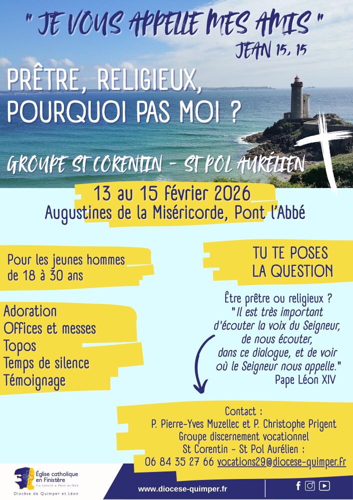 Groupe discernement vocationnel St Corentin – St Pol Aurélien : 06 84 35 27 66 / vocations29@diocese-quimper.fr