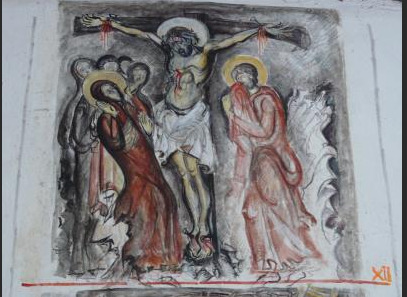 Il est neuf heures du soir… et il y a de la lumière dans l’église! Que se passe t-il? Nous sommes en novembre, il ne fait pas chaud et ce soir il pleut. Je vais rapidement à l’église, et je trouve auprès de la sacristie un homme jeune d’une trentaine d’années environ en train de travailler malgré le froid. Il s’appelle Ionel Panaït, et c’est un réfugié politique du temps de Ceaucescu. Dans les années quatre-vingt, on a effectué de grands travaux à l’église de Tréflévénez. Lorsque l’on a retiré l’autel et le retable auprès de la sacristie est apparue une fresque du XVIIème siècle représentant Jésus en croix entouré des instruments de la Passion. Mais hélas la couche de chaux qui supporte la fresque est boursoufflée en bien des endroits et Ionel a bien peur que tout ne se décroche du mur. Il est là, la seringue à la main, et il essaie de recoller la couche de chaux au mur centimètre par centimètre. Avec patience, jour après jour, il réussira à tout sauver et plus tard à restaurer la peinture elle-même.