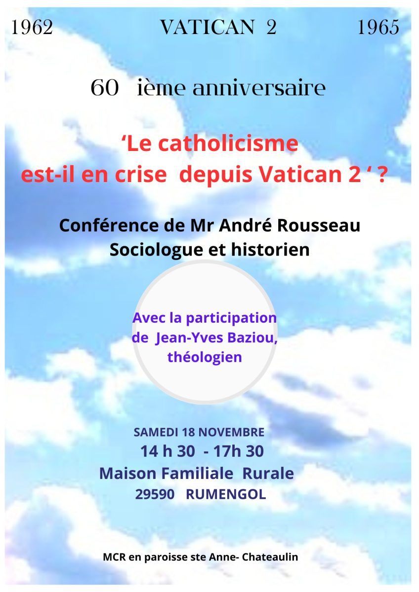 À l’occasion du 60ème anniversaire de Vatican II, le Mouvement Chrétien des Retraités (MCR) en paroisse de Ste Anne de Châteaulin organise une rencontre à la Maison Familiale Rurale de Rumengol, le samedi 18 novembre 2023 à 14h30 sur le thème : ‘’ Le catholicisme est-il en crise depuis Vatican II ? “