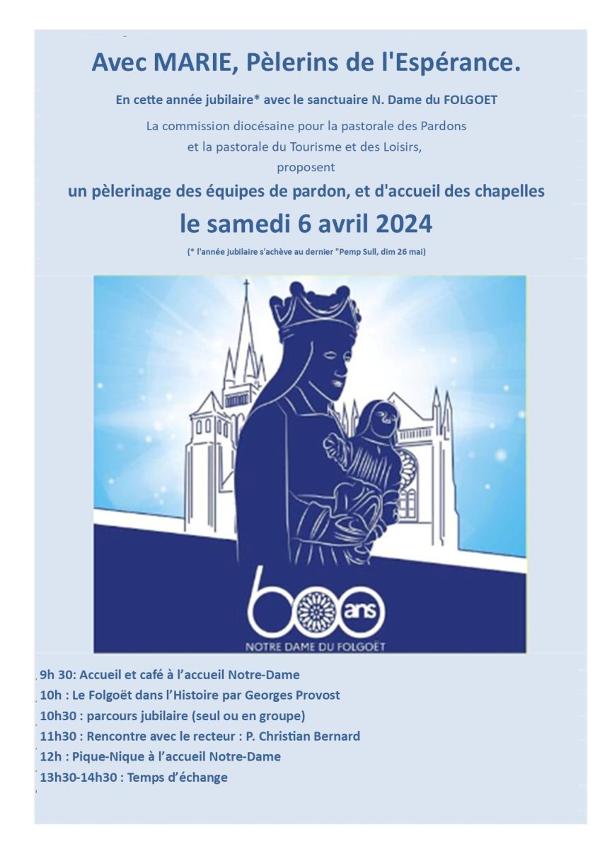 En cette année jubilaire* avec le sanctuaire N. Dame du FOLGOET, la commission diocésaine pour la pastorale des Pardons et la pastorale du Tourisme et des Loisirs, proposent un pèlerinage des équipes de pardon, et d’accueil des chapelles le samedi 6 avril 2024 (* l’année jubilaire s’achève au dernier « Pemp Sull, dim 26 mai)
