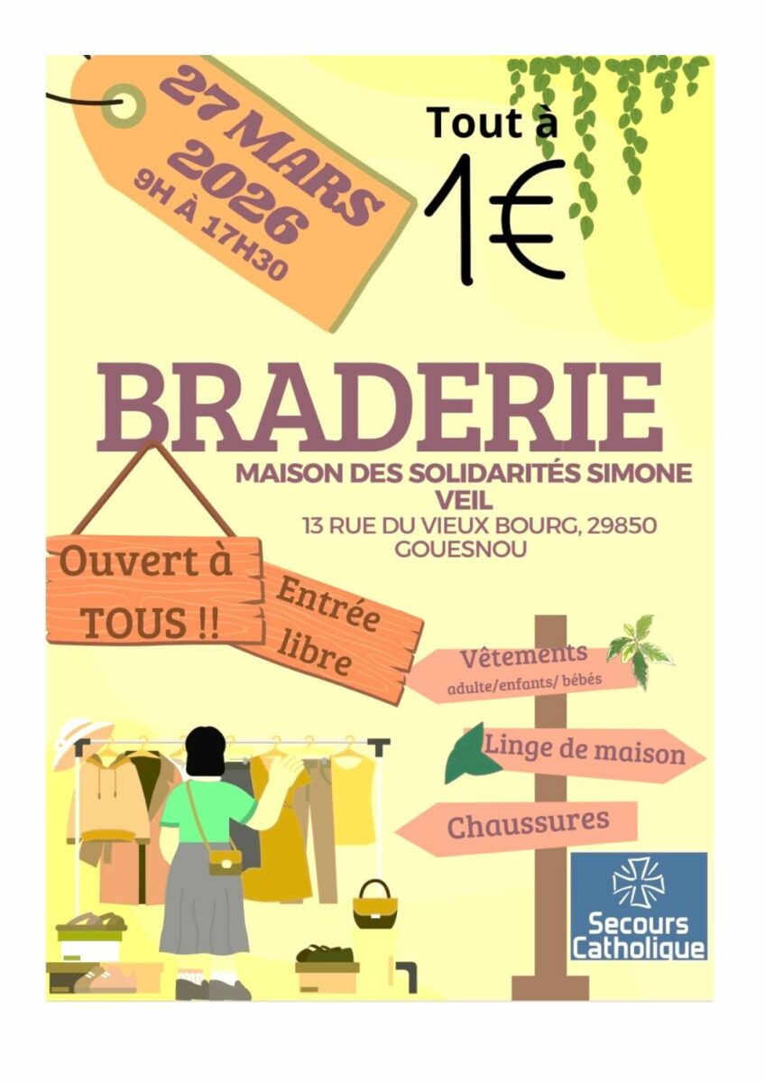 Vendredi 27 mars, de 9h00 à 17h30 aura lieu la braderie du Secours Catholique à la Maison des Solidarités Simone Veil 13 rue du Vieux Bourg à Gouesnou.