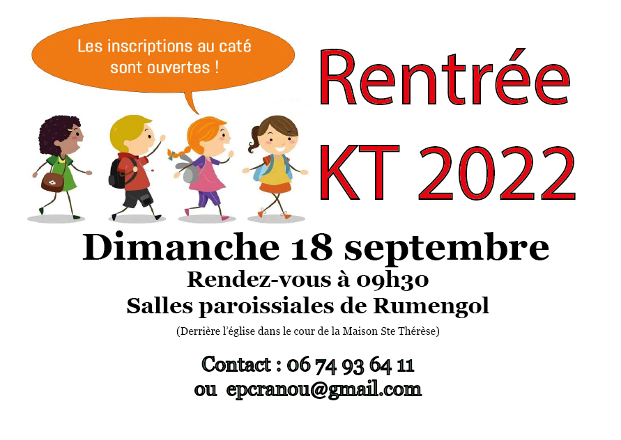Dimanche 18 septembre accueil des familles  et des enfants , à partir de 9h30 dans les salles paroissiales de Rumengol ( derrière l’église )  pour les renseignements et les inscriptions. Plus d’infos au 06 74 93 64 11 – epcranou@gmail.com