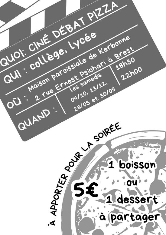 Le samedi 13 décembre, de 18h30 à 22h à la maison paroissiale de Kerbonne aura lieu le premier ciné-débat-pizza de l’année à destination des collégiens et lycéens.