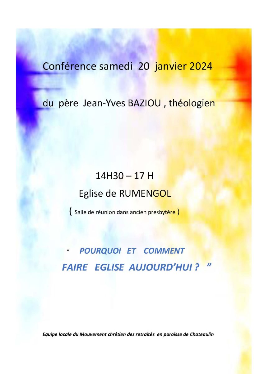 Une conférence du père Jean-Yves Baziou le 20 janvier de 14h30 à 17h00 à l’église de RUMENGOL (Salle de réunion dans l’ancien presbytère) organisée par l’équipe locale du Mouvement chrétien des retraités en paroisse de Châteaulin