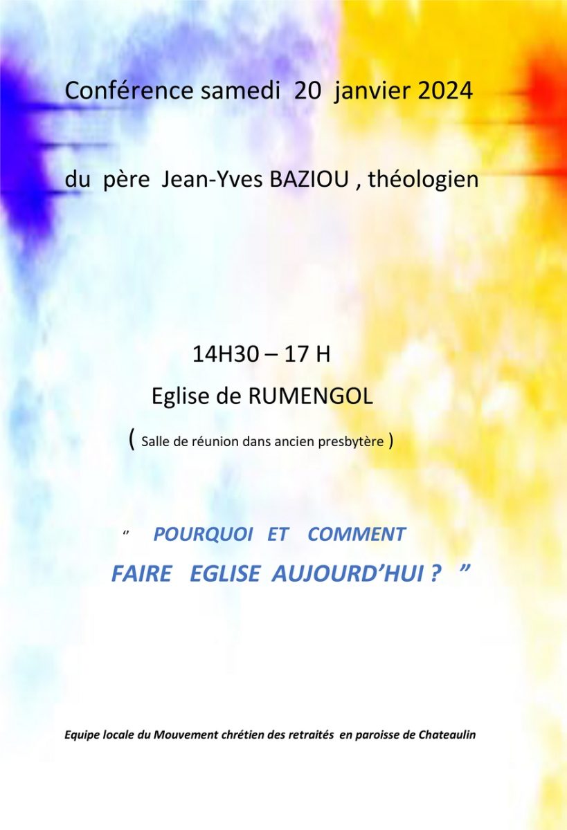 Dans la continuité des conférences sur Vatican 2, l’équipe locale du Mouvement Chrétien des Retraités, en paroisse de Châteaulin vous invite à une conférence/débat du père Jean-Yves Baziou, théologien, LE SAMEDI 20 JANVIER 2024 de 14h30 à 17H00, à la salle Notre-Dame derrière l’église de Rumengol, accès par la cour du presbytère.