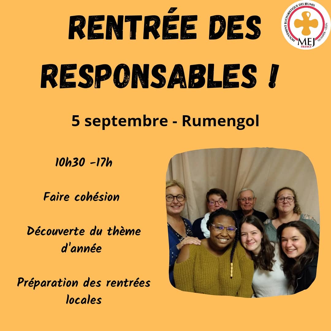 Cette année, et contrairement aux précédentes éditions, la rentrée du MEJ 29 se fera sous une nouvelle forme. En effet, il y a aura d’abord une journée de rentrée pour tous les responsables, amis du MEJ de longue date, majeurs intéressés par le mouvement. Cette journée se tiendra à Rumengol, le dimanche 5 septembre, de 10H30 à 17H. Au programme de cette journée : : Eucharistie à 11h, temps de convivialité et cohésion, Réflexion autour du nouveau thème d’année, préparation et réflexion pour les rentrées du MEJ Finistère.