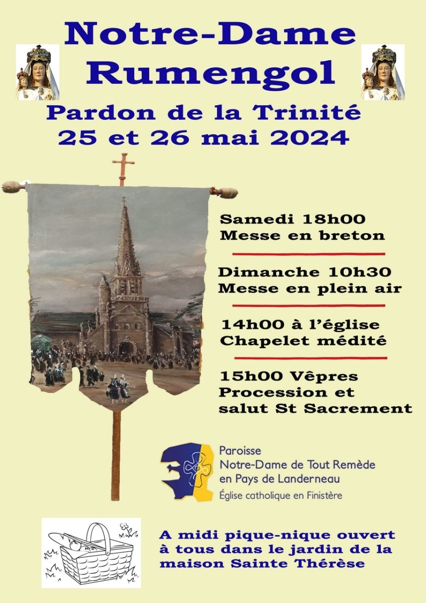 Le dimanche de la Trinité accueillera le premier pardon diocésain de l’année à Notre-Dame de Rumengol les 25 et 26 mai 2024. Les pèlerins sont invités à venir à la rencontre du Dieu trinitaire Père, Fils et Saint-Esprit à proximité de la Vierge, toujours prête à intercéder pour nous.