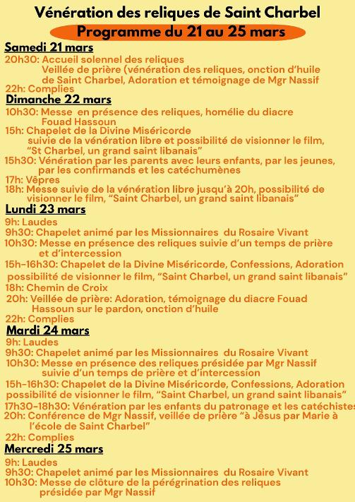Messe, Chapelet, Adoration, Confession, Conférence, Vénération libre…