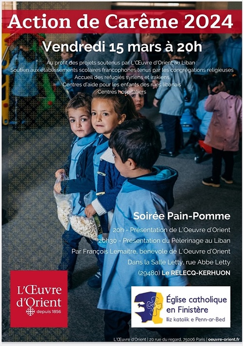 En limitant le repas de ce soir-là à un partage de pain et pomme (fournis sur place), chacun pourra glisser dans un tronc, l’équivalent du prix d’un repas (ou plus) au profit des oeuvres des Chrétiens d’Orient que représenteront Pascale BEGIN et François Lemaitre lors de l’entretien que nous partagerons avec eux au cours de la soirée.