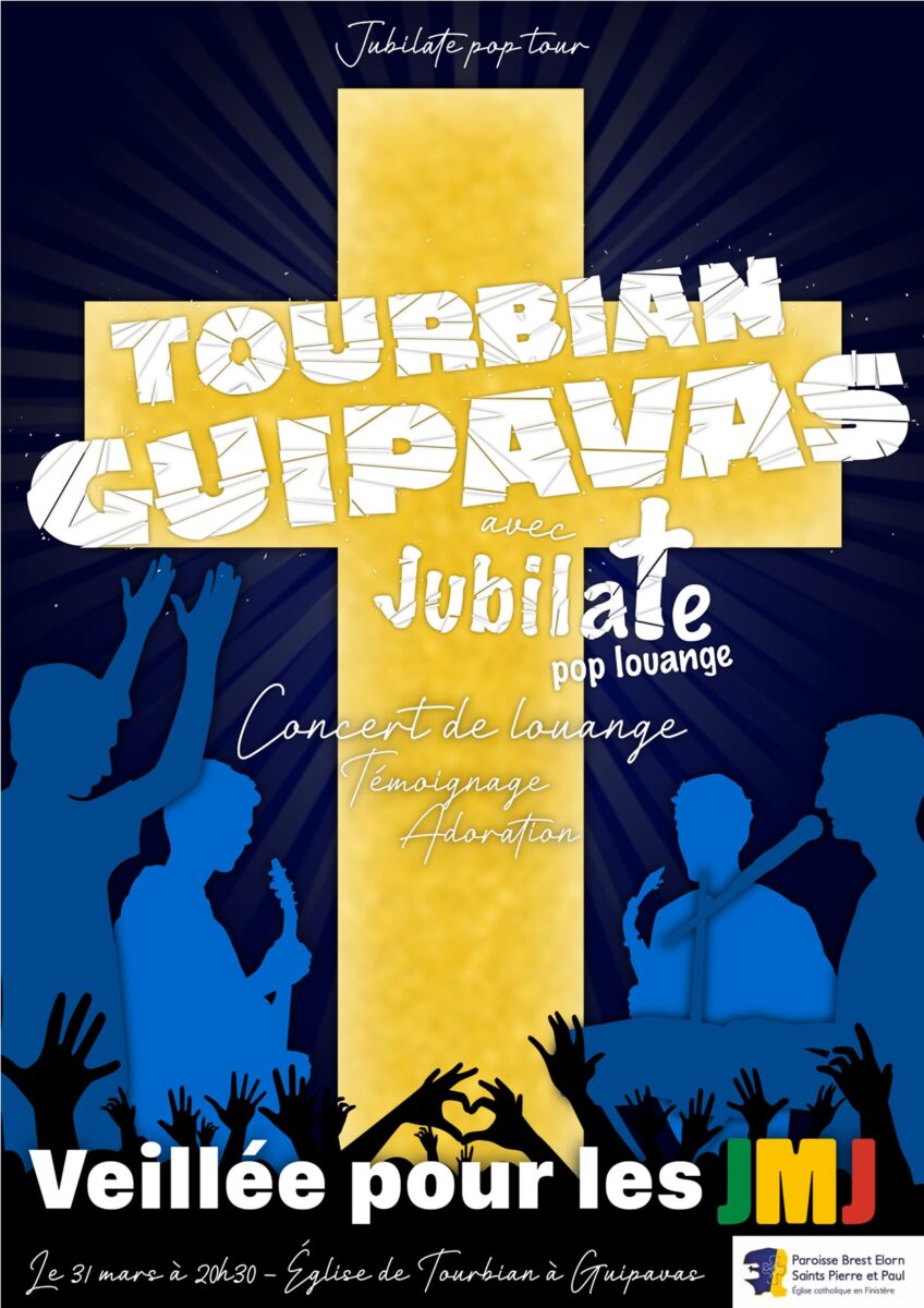 Les jeunes de la paroisse Brest-Elorn, en partance pour les JMJ de Lisbonne proposent une veillée de pop-louange à l’église Notre-Dame de Tourbian à Guipavas (29). Ils ont invité le groupe Jubilate Pop Louange pour animée cette soirée.