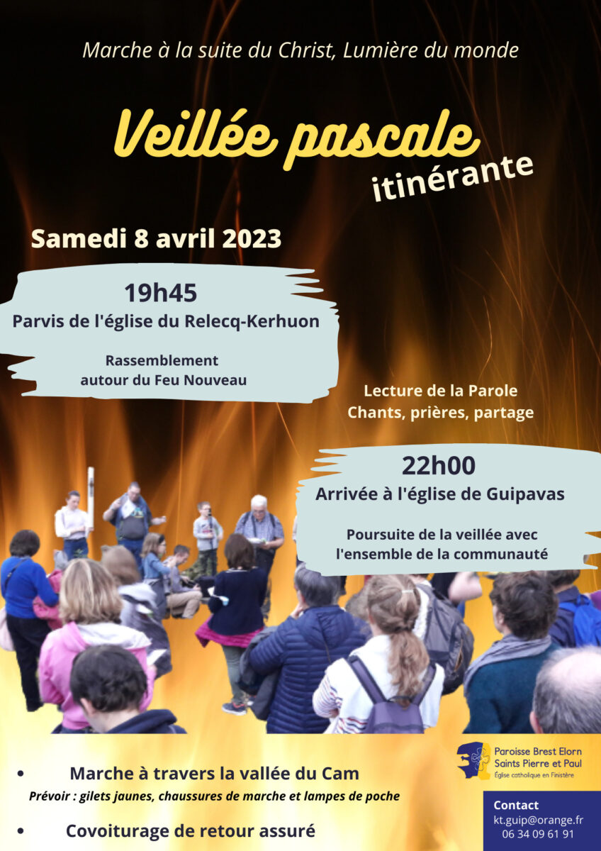 Vers 22 heures ce sera l’arrivée à l’église de Guipavas où sera poursuivie la veillée avec l’ensemble de la Communauté.