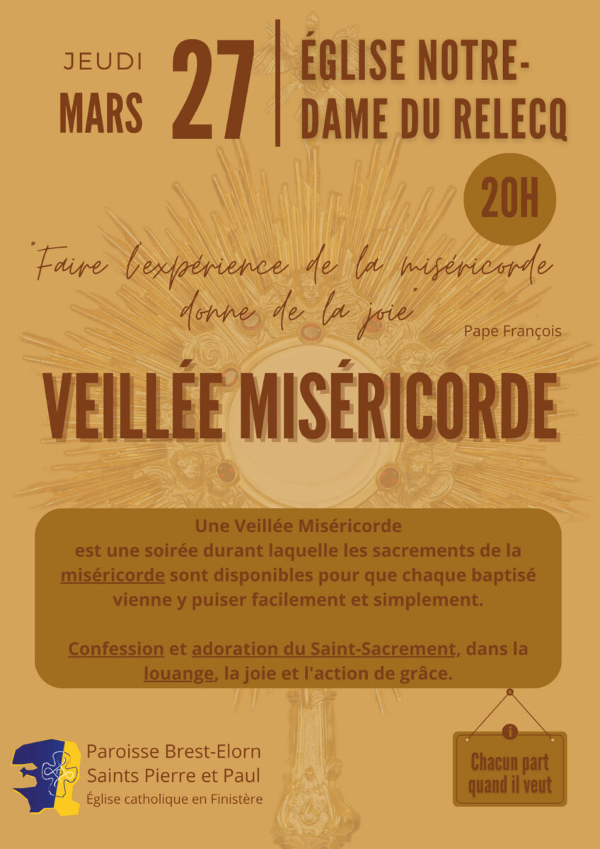 Soirée avec prière, chants, adoration du Saint Sacrement à 20heures à l’église Notre Dame du Relecq-Kerhuon.