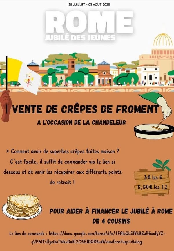 Pour aider 4 jeunes à se rendre à Rome pour le jubilé des jeunes du 28 juillet au 5 août vous êtes invités à commander des crêpes au prix de 3 euros les 6 ou 5,5 euros les 12.