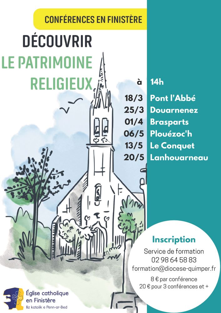 Le service diocésain de formation propose des conférences sur le patrimoine religieux finistérien afin de rendre accessibles les richesses de notre diocèse. Il s’agit de de faire connaître et découvrir des sites remarquables souvent méconnus illustrant les thèmes choisis. Les conférences sont proposées à la fois dans le Nord et le Sud du département.